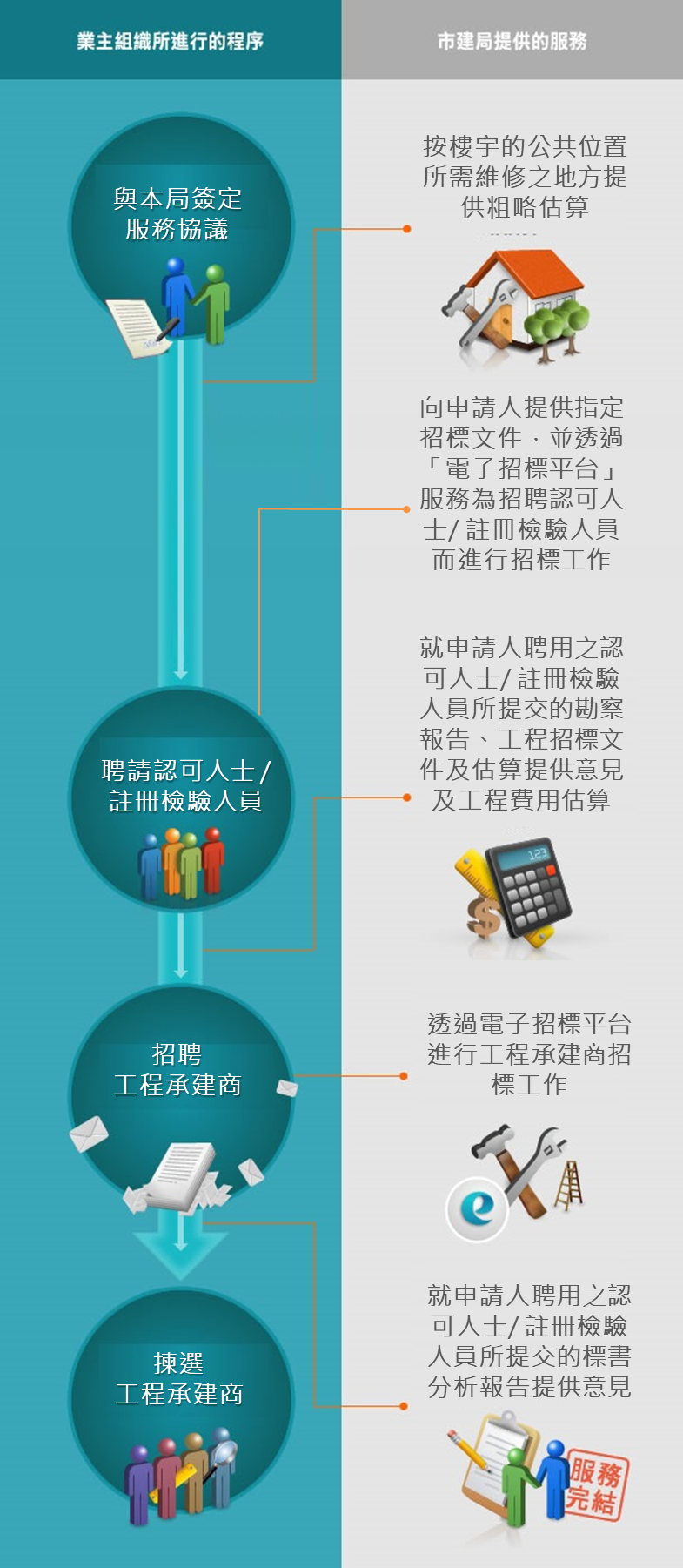 「招標妥」樓宇復修促進服務(招標妥)為一項收費服務計劃,旨在為業主組織(申請人)就樓宇維修工程提供支援服務,並透過電子招標平台招聘認可人士/註用檢驗人員(或能提供相關服務的顧問公司)及合資格註冊承建商以進行樓宇公用地方的維修工程。